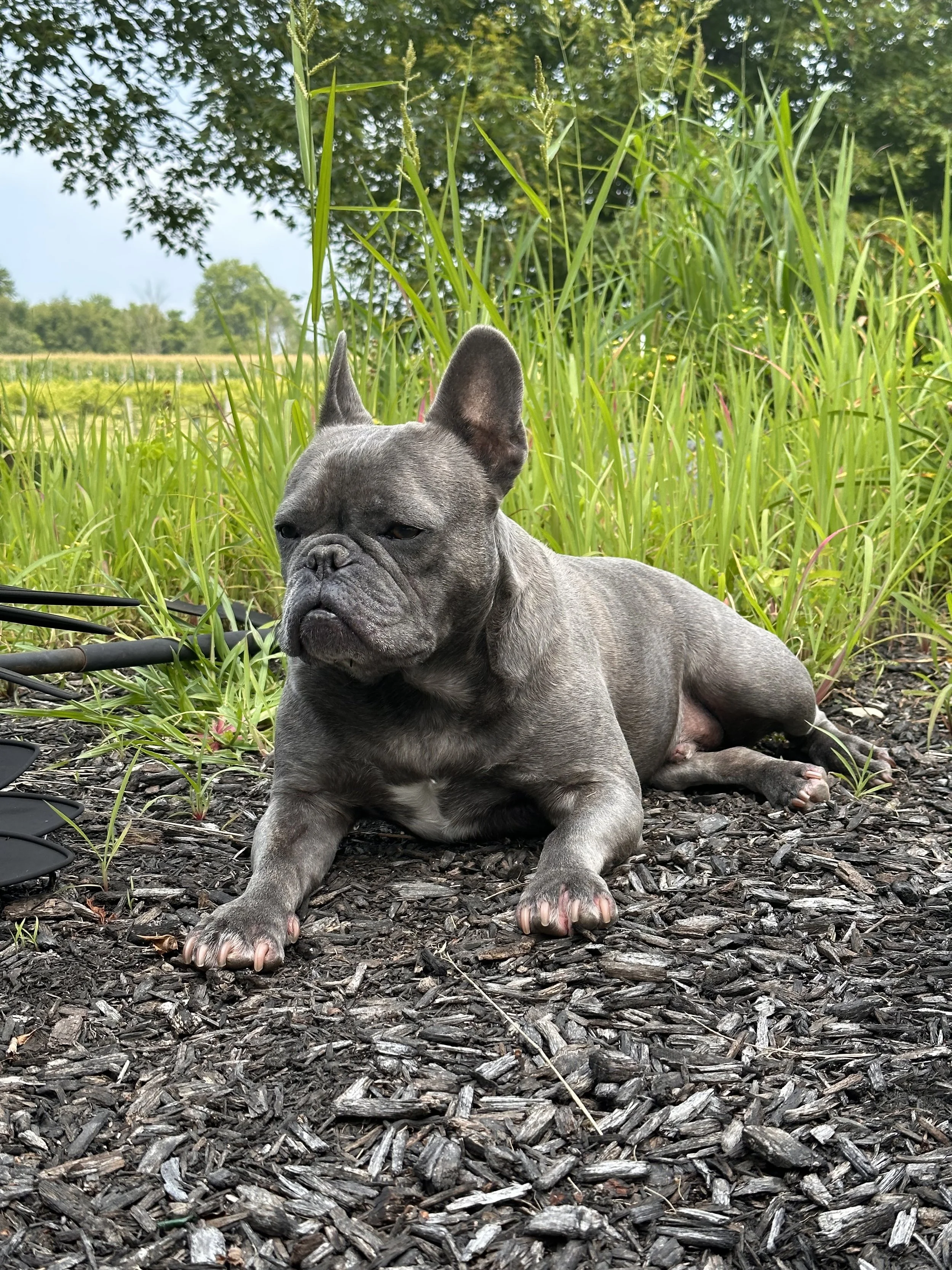 The OG blue Frenchiesmart, bossy, and happiest when he's claiming toys and hanging with the humans